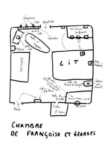 Des lits et des chambres, ils en ont partagés bien d’autres et entre autres, un lit qui les fait sourire, c'est celui de la mère de Georges. Quand le père de Georges, le mari de la mère de Georges est mort, sa mère a continué de dormir dans le lit marital. Elle avait creusé au fil des années solitaires un grand trou dans le matelas, un matelas qu’elle avait confectionné elle-même avec de la laine du pays, le pays, c’est la Savoie. Lorsque Françoise et Georges allaient lui rendre visite, elle leur prêtait son lit et ainsi ils tombaient au milieu du lit dans un grand trou et se retrouvaient de surcroît serrés l’un tout contre l’autre.