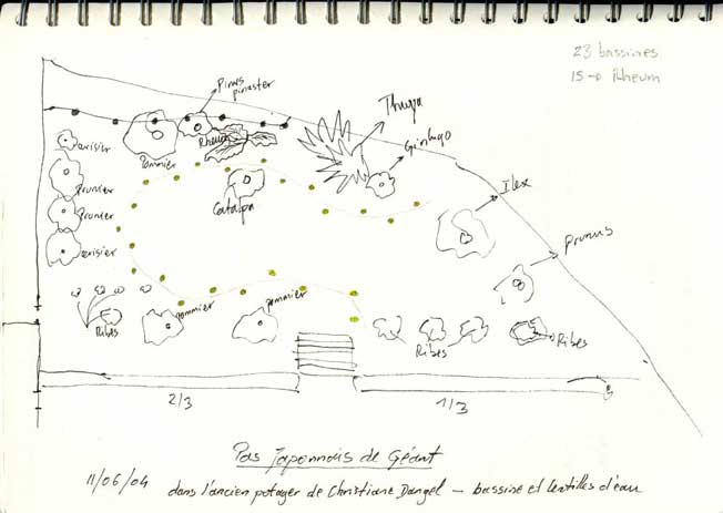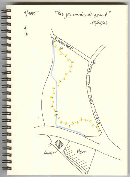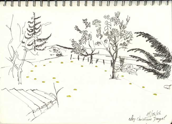 Pas japonais de géant (pas japonais de lentille d'eau) Ce serait l'idée de créer un « pas japonais » dans l'ancien potager de Christiane. Car dans un pas japonais, chaque endroit où l'on peut poser le pied est assez distant... et peut amener au déséquilibre ! ! ! C'est un peu la sensation que j'ai eue dans cette rencontre avec les anciens... On avance à petits pas ! ! ! Un pas japonais de lentille d'eau réalisé avec des bassines métalliques. Le choix des lentilles d'eau, c'est parce que Christiane... au début m'avait proposée deux lieux d'interventions possibles : ·Le parc autour de sa maison ·Un pré lui appartenant, près du lac de pêche Dans le pré... assez ordinaire, mais avec un petit ruisseau qui le traverse, il me semble difficile d'intervenir, car c'est un pré de fauche... et il accueil les chevaux des promeneurs qui dorment au gîte d'Ouroux. Mais en contre-bas du lac, et servant de tampon lors du vidage et curage du lac... aussi pour les poissons... se trouve deux bassins couverts de lentilles d'eau. Je me suis dit que pour faire le lien entre ces deux lieux... il serait bien d'utiliser les lentilles. Les lentilles d'eau ont aussi une autre signification, c'est une plante qui vit à la surface de l'eau, libre de tout ancrage, ses feuilles (unique) flottent sur l'eau (au gré du vent), ne font qu'un millimètre de diamètre, et on une petite racine qui pend dans l'eau mais qui ne s'accroche à rien ! ! ! Elle couvre la surface de la mare par une succession de pointillés... Ceci me faisait penser à la relation que j'ai eue avec Christiane... en pointillée? mais cette succession de petits points ajoutés a donnée une rencontre chaleureuse et douce... qui va peut-être couvrir la mare. Cette multitude de lentille d'un millimètre de diamètre, me font penser aussi à la multitude d'activités dans lesquelles est impliquée Christiane. Christiane adore les plantes, elle les connaît très bien en tant qu'ancienne infirmière... elle a d'ailleur du mal à couper... à tailler... Il n'y a qu'a regarder son jardin avec ces arbres majestueux d'essences différentes, et tous ces arbustes à fleurs... et je ne parle pas des annuelles disséminées judicieusement un peu partout ! ! ! Alors..., la lentille d'eau, c'est aussi la plante d'Europe qui produit la plus petite fleur... J'aimerais bien lui faire découvrir une fleur qu'elle ne connaît pas ! ! ! J'aimerais utiliser des bassines métalliques, anciennes, récupérées chez les gens du canton, car je pense que c'est une possibilité d'investir Christiane... un petit peu... c'est à dire en fonction du nombre de personnes qu'elle connaît, qu'elle côtoie... elle devrait pouvoir trouver une vingtaine de bassines ! ! ! Le lendemain : 12/06/04 Rencontre avec Christiane, et explication du projet. Le projet lui plait... mais l'idée de le faire chez elle pas du tout ! ! ! Elle considère que si je fais quelque chose, cela doit être vu par le maximum de gens... et elle à peur de se faire envahire... les gens n'ont aucun respect des lieux. D'autre part, elle est très peu souvent chez elle... courant toujours de réunion en réunion ! ! ! Un autre argument est qu'elle est conseillère municipale... et dans les petits villages ça jase beaucoup... Christiane n'a pas envie que l'on dise qu'elle utilise des deniers publics pour faire aménager son jardin personnel. Déception ! ! ! Donc on se rabat sur le pré... Qui est quand même chez elle ! Les chevaux seront mis ailleurs ! Le pré va être fauché, les bassines seront installées le long du cours d'eau, et il sera possible d'entretenir avec du matériel plus léger. ![]() ![]() ![]() |