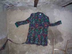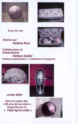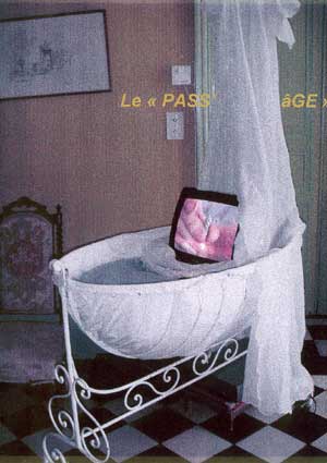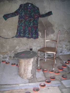 « Le gourbi de la vie » Une installation qui interroge assez pour mettre en scène Pierre Michon vecteur des symboles évoqués ici. Le haut débit d'une conversation ou des piliers bien ajustés le maintiennent. Une vie à partager et comment ! L'étrenne d'une vieillesse suspendue à un fil... Un voyage dans le temps, ou la vive impression que les expériences de la vie nous invitent et nous enseignent toujours avec cet éternel recommencement. Ces échanges qui font que le regard de chacun nous remet toujours en doute. Rajeunir la pensée, tel une vivace qui rituellement fane et renaît... ou la repasser comme une belle robe pour enlever les plis fripés, la laisser reposer dans la bouche comme un bon vin... Différentes façons de rendre mobile l'immobilité accélérée, suspension d?un début, d'un toujours... Une oeuvre commune est née de cela... Valérie Ruiz le 17.06.2004