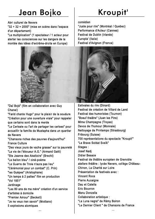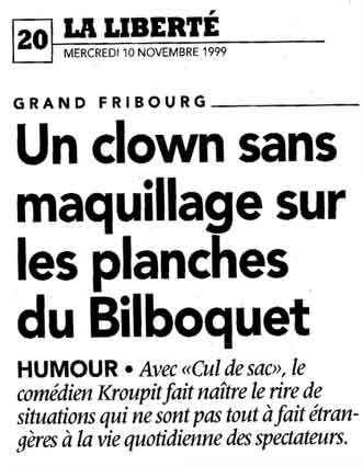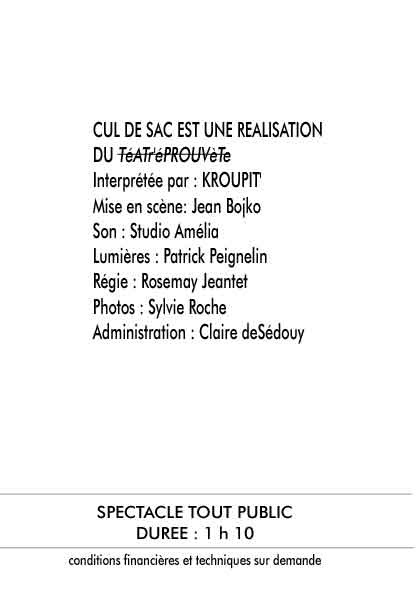 A tant de questions il doit se trouver une réponse... Peut-être dans ce " Cul de sac" où nous nous amuserons à vous entraîner.... La pièce est drôle, très drôle et pourtant sérieuse, très sérieuse... Eh ! oui rire c'est bien, mais rire avec raison: c'est mieux?..