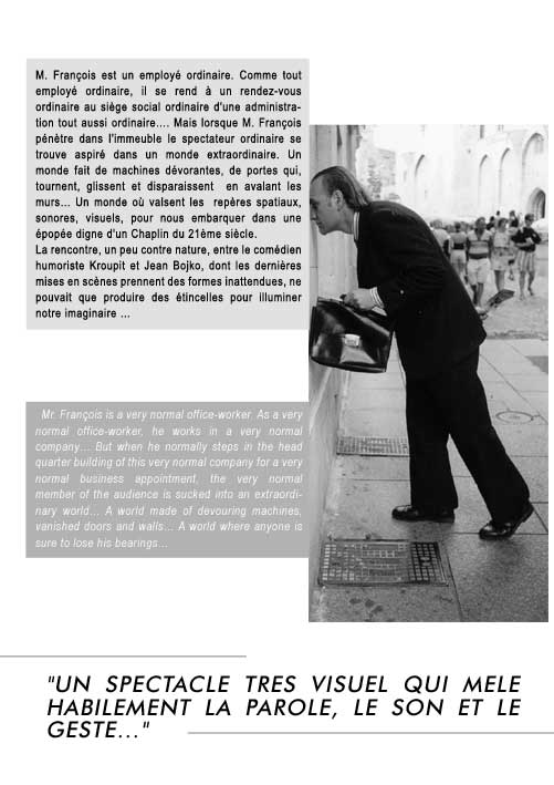 M. François est un employé ordinaire, avec son costume gris ordinaire et sa serviette de cuir avachie. Comme tout employé ordinaire, il a un rendez-vous ordinaire au siège social d'une administration tout aussi ordinaire. Mais lorsque Monsieur pénètre dans l'immeuble, le spectateur ordinaire va être projeté dans un monde extraordinaire? Un monde fait de machines, de portes qui s'ouvrent qui claquent, qui glissent, qui tournent sur elles-mêmes, qui disparaissent... Un monde peuplé pourtant d'autres employés qu'on devine qu'on croise sans pouvoir les arrêter. Un monde où l'imaginaire devient folie et où le moindre geste la moindre mimique, le moindre regard le moindre mot entraîne dans une épopée digne de Chaplin ou de Buster Keaton.